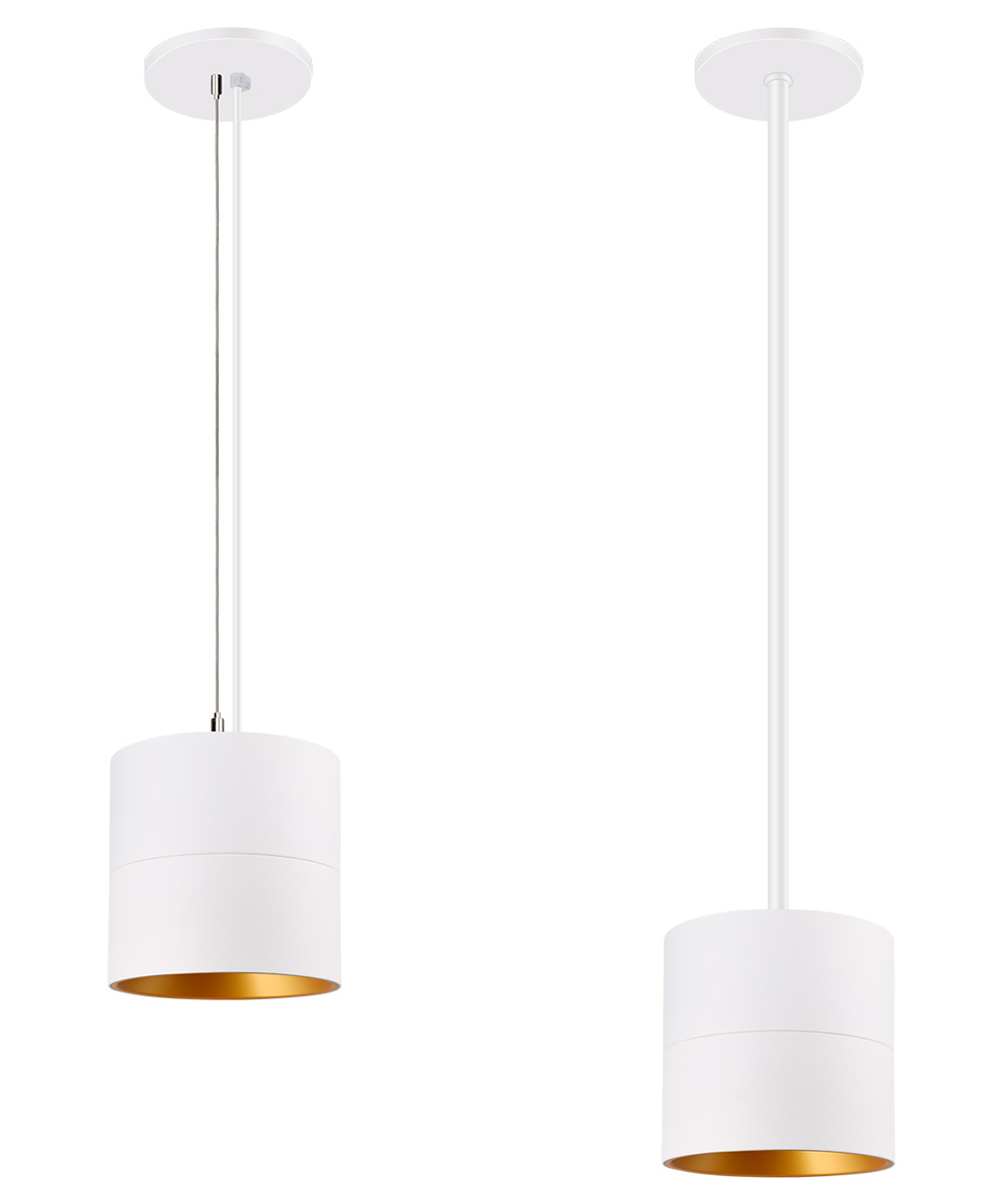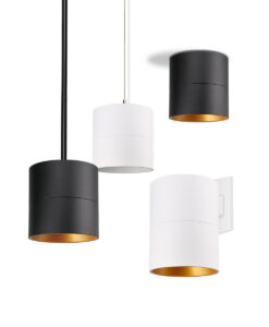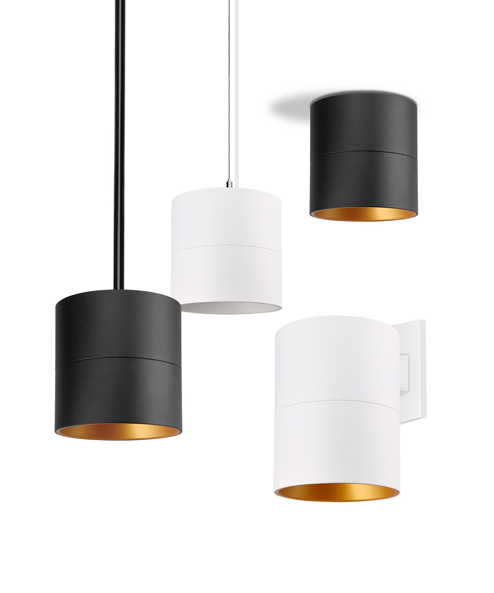 The cylinder form factor is offered in pendant, surface-mount, and wall-mount configurations, finished in beautifully anodized white or black. These fixtures deliver a refined decorative appearance while maintaining high lighting performance.